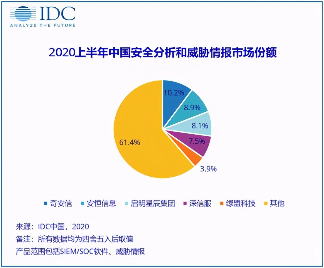 10月21日,国际权威咨询机构IDC发布了《2020年上半年中国IT安全软件市场跟踪报告》。报告显示,2020年上半年中国IT安全软件市场规模为5.5亿美元(约合38.7亿元人民币),较2019年上半年增长2.63%。其中在安全分析和威胁情报市场,奇安信以10.2%的市场份额,夺得2020上半年该细分领域第一名。