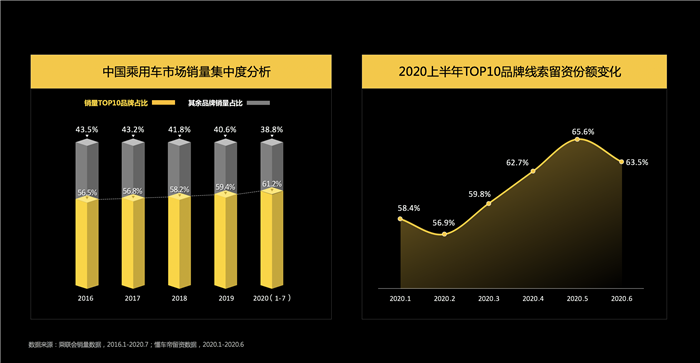 近年来,中国汽车市场逐渐从增量时代走向存量时代。当下,汽车销量的头部品牌效应显著,TOP10的汽车品牌销量占比逐年走高,2020年1至7月已经占据了市场61.2%的汽车销量。同时,《报告》显示2020年上半年TOP10的品牌留资份额持续提升,用户留资的品牌集中度不断增强。