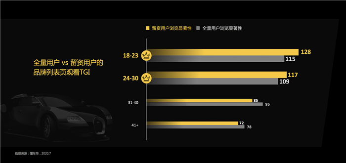 《报告》提出,懂车帝口碑列表页流量份额在7月较年初增长1.7%,30岁以下用户的车系口碑面浏览显著性均超过100,年轻用户因经验缺乏引发的“避坑”需求更为显著,TA们不仅在看口碑,同时也更愿意去分享 。而在留资决策阶段,80后及90后留资意向用户对口碑内容的浏览显著性突出,对80后用户而言,口碑对于高意向用户更具显著作用力。