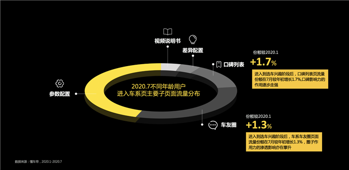 平台社交体验也成为年轻群体关注重点。懂车帝车友圈作为车圈的“社交”阵地,90后年轻用户对车友圈的关注更突出。《报告》指出,车系车友圈页面流量份额在7月较年初增长1.3%,相对于中年用户,30岁以下用户更爱浏览车友圈内容,在选车时加入该车系车友圈显著性也更强。