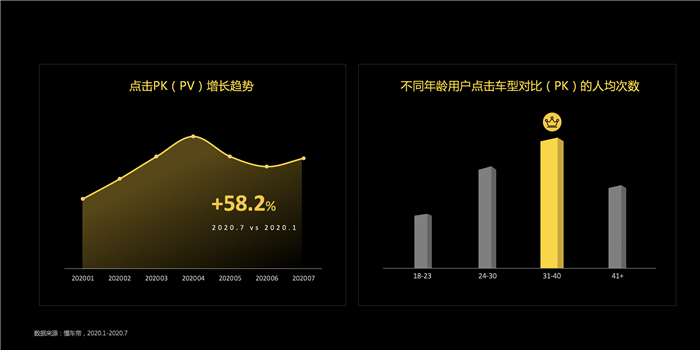在产生兴趣之后的沉淀阶段,用户对比意愿逐步增强,80、90后主力购车用户的对比能力相对显著。懂车帝点击PK(PV)增长趋势成波动上升状态,7月份较1月份增长58.2%。其中31~40岁成熟用户点击车型对比(PK)的人均次数最高。