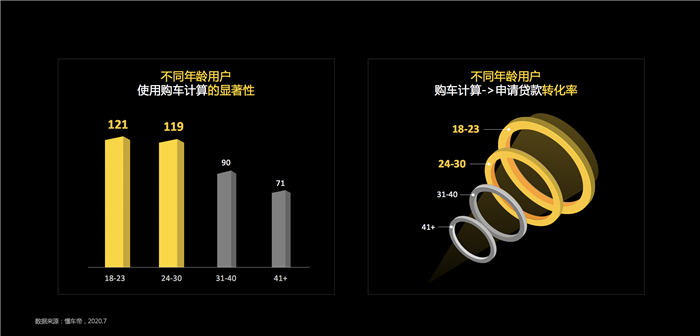 值得一提的是,年轻用户的消费概念更显激进。《报告》指出,90后用户的计算车价敏感度更高且拥有更强的“超前消费”意愿,金融渗透对年轻用户的触达能力更为显著。其中,18-23岁使用购车计算的显著性最高,且申请贷款转化率占比最大。