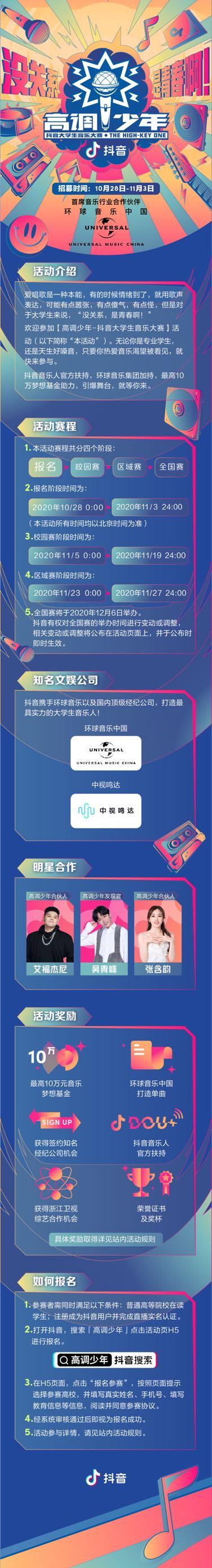 作为面向大学生群体的音乐大赛事,"抖音大学生音乐大赛"以"没关系,是青春啊"为活动主题,吸引了百所高校积极参与。据了解,普通高校在读学生注册成为抖音用户并完成直播认证两大条件,在抖音搜索"高调少年"并在对应H5页面填写报名信息即可参赛。