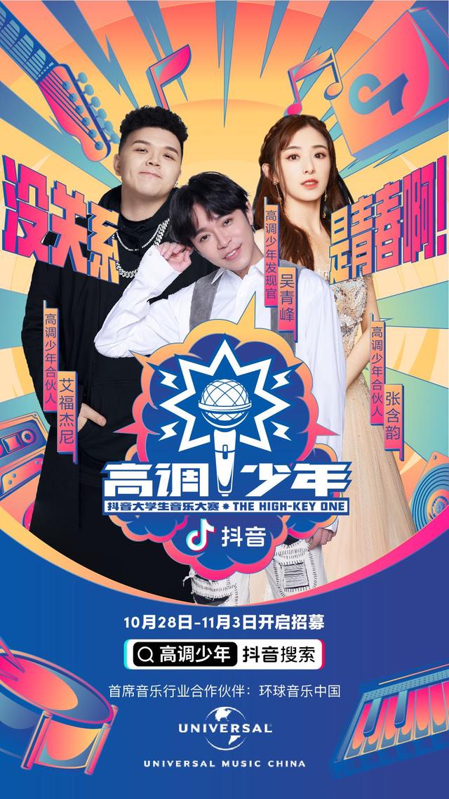 10月28日,"高调少年-抖音大学生音乐大赛"(以下简称抖音大学生音乐大赛)正式开始招募报名,报名时间将持续至11月3日,希望招募热爱音乐的校园歌手们,在更大的舞台高调"发声"。据了解,本次活动将由知名歌手吴青峰担任"高调少年发现官",由全球音乐娱乐巨头环球音乐集团旗下环球音乐中国(以下简称环球音乐中国)作为"首席音乐行业合作伙伴",活动主要分为报名、校园赛、区域赛、全国赛四大阶段,将通过线上直播+线下公演的比赛形式选出全国5强选手,并为参赛选手送上环球音乐中国签约机会、抖音音乐人官方扶持等超值激励,更为5强选手送上音乐梦想基金、联合环球音乐中国为全国5强发布全新个人单曲并打造经典翻唱曲目的超级奖励。在赛事进行过程中,平台用户可以通过打榜、投票等互动行为,助力心仪选手成功晋级。