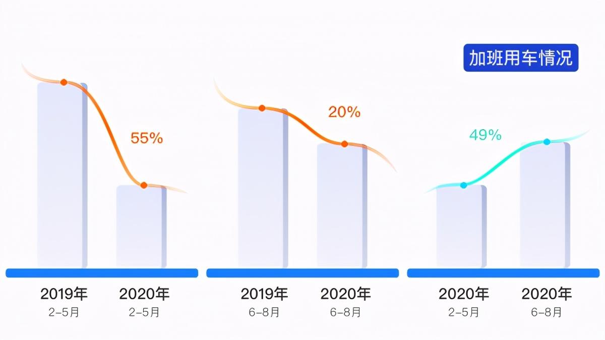 随着6月起各行业基本实现复工复产,加班用车量出现反弹。数据显示,虽然2020年6月-8月夜晚加班用车比去年同期减少20%,但相比今年2月-5月用车量却增长了49%,这表明夜晚加班用车需求已经呈现明显复苏状态。