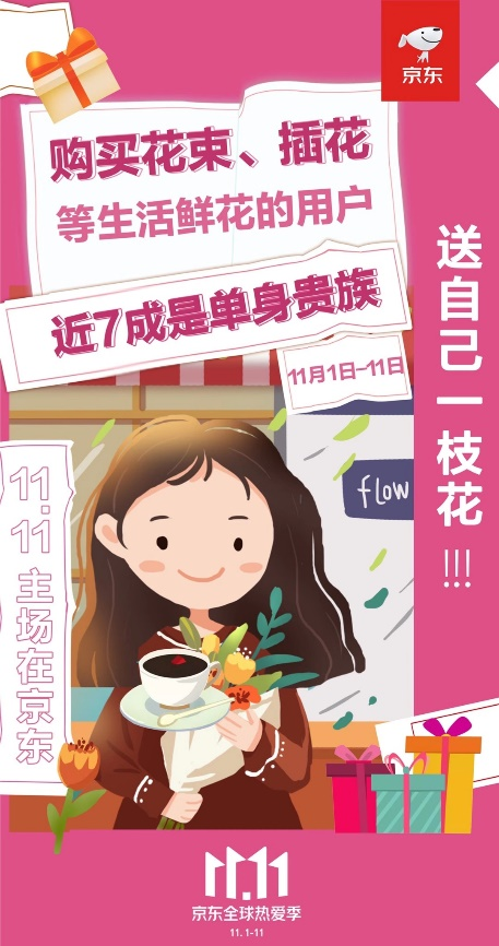 比如,表白得准备花朵,但在刚刚过去的11.11,渴望脱单的人太多,各大花店要么备货不足,要么磨刀霍霍,一时疏忽多花钱是小事,订不到花耽误效果才最要命。有先见之明的,早就关注着京东鲜花园艺,11.11期间准时下单,产地直达、量大价优还带着清晨露水的鲜花就来到了手上。在 11.11 期间,1500多万支鲜花的交易额中,少不了999枝玫瑰的鲜花阵。在这个特殊的日子摆出这么大阵势,要么证明你有钱,要么证明你足够聪明,能找到合适的路子,不管哪一条,都能让你在脱单的道路上一路狂奔。
