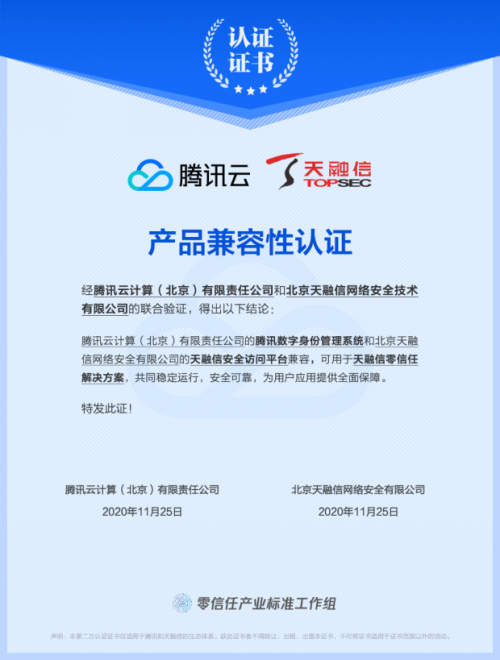 2020年9月,由中国产业互联网发展联盟标准专委会指导成立的国内首批零信任产业标准工作组,发起了“零信任产品兼容性认证计划”,旨在加强零信任产品间的技术兼容和互联互通,解决不同厂商间产品互操性差、复用率低等问题,助力产业标准化、规范化发展。天融信与腾讯作为该计划的共同发起方,率先完成产品兼容性互认证。