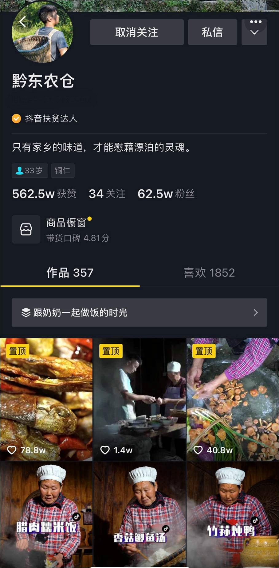 此前,丁浪没想过通过@黔东农仓 做电商带货。2019年10月,当地紫薯滞销,为了推销德江紫薯,丁浪和张金秀奶奶一起,拍摄了多条用紫薯做饭的视频,在抖音达到1000多万播放量,帮农户卖了5000多单、2万多公斤紫薯。“那时候我们才发现在抖音带货销量很大,内容电商更适合我们。”丁浪回忆着那次契机之后,抖音电商和当地发起了县长直播带货,使用了@黔东农仓 的账号,这更坚定了他们在抖音上卖家乡好物的信心。