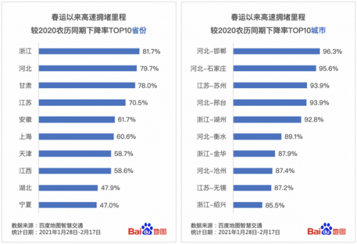 与此同时,也有部分地区受到疫情影响,高速拥堵情况与去年相比有所缓解。春运以来,高速拥堵里程较2020年农历同期下降率排名TOP10的省份依次为:浙江、河北、甘肃、江苏、安徽、上海、天津、江西、湖北和宁夏,其高速拥堵里程与去年农历同期相比均下降超过47%。而在城市层面,高速拥堵里程同期下降率TOP10的城市主要集中在河北、浙江、江苏等地,下降率均超过85%。