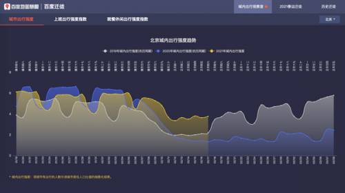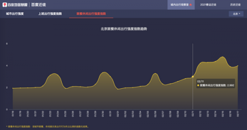 在刚刚过去的春节长假里,很多家在外地的人选择作为“原年人”就地过年,带动了各地城内出行强度的升高。据百度地图迁徙大数据平台城内出行观察室数据可知,2021年春节期间,全国多地城内出行强度明显高于前两年。以北京为例,春节假期期间(从大年三十至正月初六),2021年北京城内出行强度均在3.3以上,而前两年同期北京城内出行强度均未高于2.5。同时,2021年春节期间,北京线下就餐休闲出行强度也呈现大幅上涨态势,较节前上升了2倍左右。