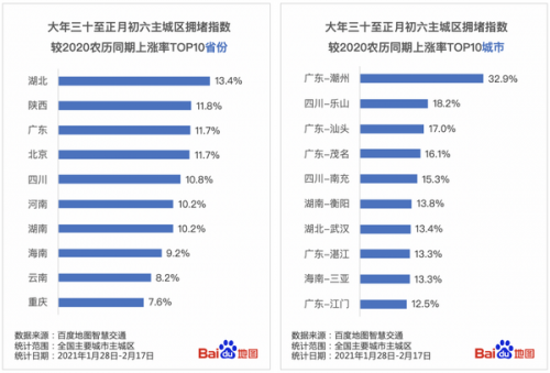 (2021春节假期主城区拥堵指数同期上涨TOP10省份及城市)