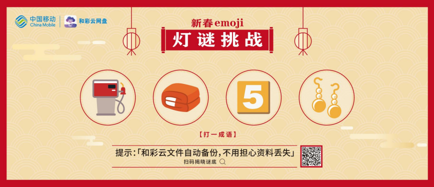 区别于传统灯谜呈现形式,该活动是以Emoji表情来让大家猜灯谜。据了解,该活动由中国移动和彩云网盘发起,希望给原地过年的小伙伴提供更多有趣新奇的年味活动,同时将和彩云品牌营销融入其中,不得不说,这样的品牌活动创意感十足!