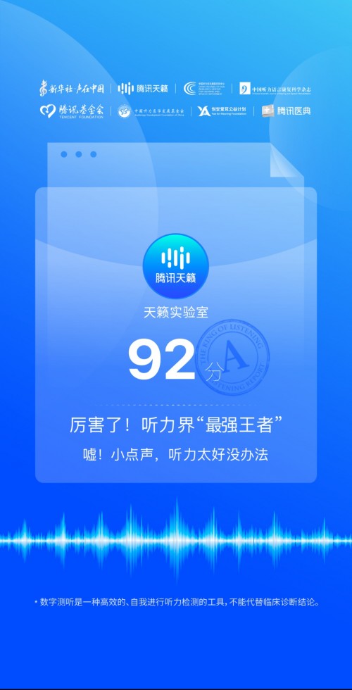 听力筛查是防止听力损失发展成为听力残疾最为有效和关键的环节。基于此,腾讯天籁实验室联合多方机构推出听力损失自测小工具——线上数字测听测试,人们足不出户即可初步判断自己的听力损失程度。