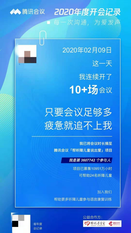 同年12月,腾讯天籁实验室又联合腾讯会议推动面向听障人士的又一科技公益举措落地——“帮听障儿童说出爱”项目,号召腾讯会议用户捐赠会议时长,按照一定比例兑换为公益金,用于帮助更多听障儿童参与语言康复训练。