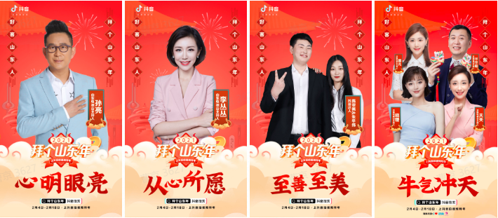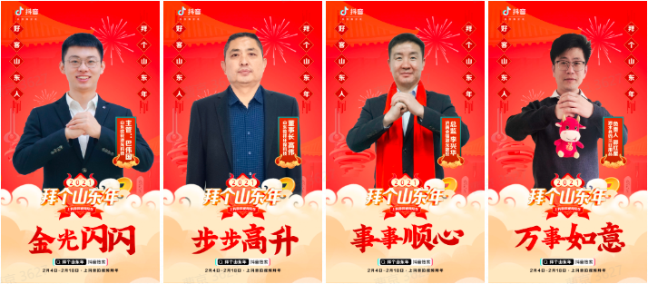 同时,借助抖音春节期间#山东式拜年#的热度,通过统一的抖音拜年视频和创意人物拜年海报,活动在春节期间掀起了山东式拜年热潮。