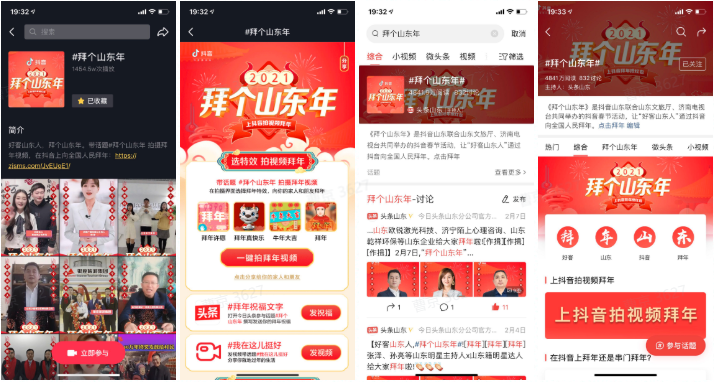 除了明星和企业家联合拜年,在春节期间,抖音同步上线了一批定制的拜年特效,用户可任意选择拜年特效拍摄拜年视频参与#拜个山东年#话题,同时,用户可以参与今日头条的#拜个山东年#话题,以文字形式向家人和朋友送上新年祝福。