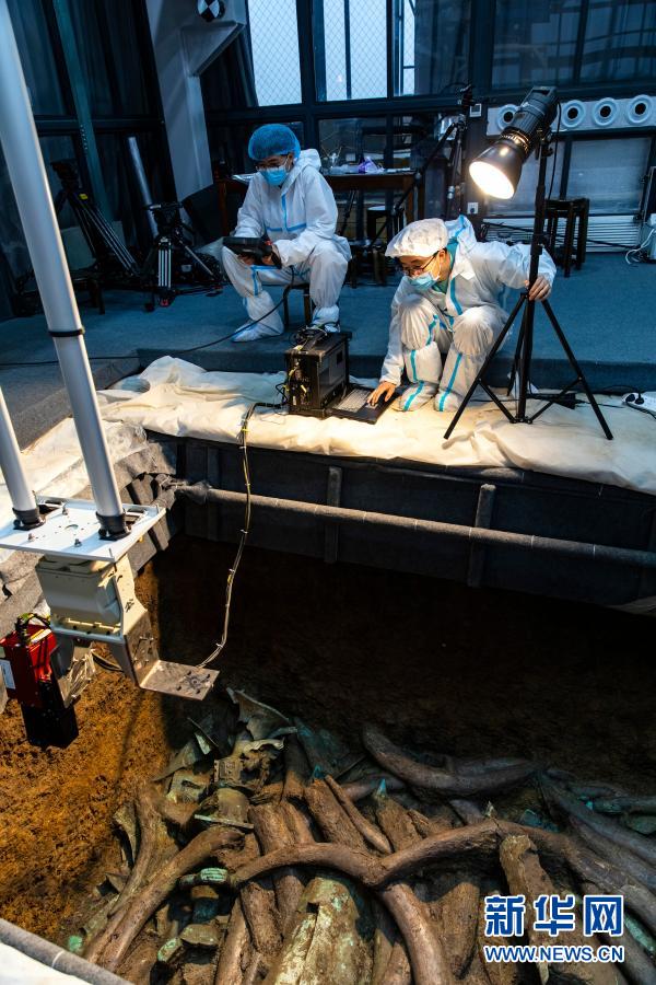 在三星堆遗址考古发掘现场3号“祭祀坑”,考古人员用高光谱成像扫描仪对文物进行光谱拍摄,以识别文物的材料和属性(3月16日摄)。