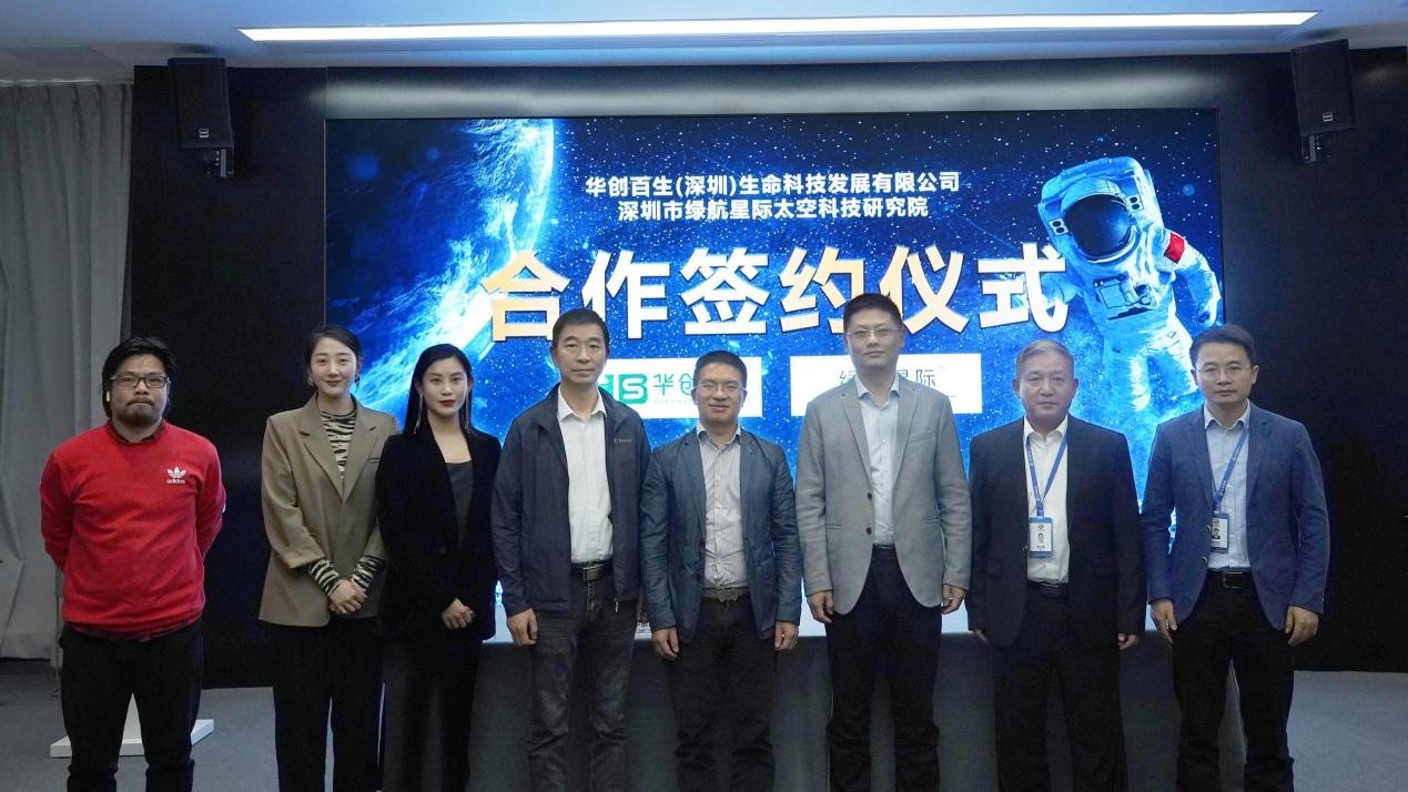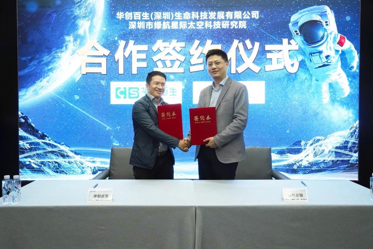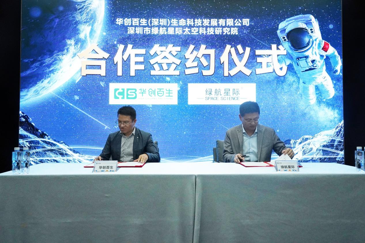 华创百生(深圳)生命科技发展有限公司执行董事兼总经理字宏军与深圳市绿航星际太空科技研究院院长许楫分别代表合作双方签署了合作协议。深圳市绿航星际太空科技研究院和华创百生相关负责人出席签约仪式。