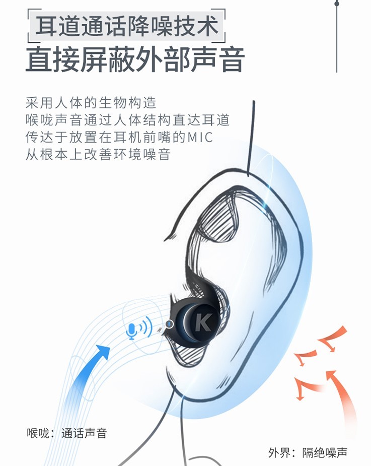 酷狗M52采用的是人体生物构造,喉咙声音通过人体结构直达耳道,传达于放置在耳机前嘴的收音麦克风,从根本上改善环境噪音,通话就像面对面一样清晰。这就让用户即便是身处在如LiveHouse、K房、酒吧、公司会议、课堂等嘈杂的场景中也可以做到,接听紧急来电时,不用大声喊叫也能让你把话说清楚,让电话对方的人听清你所讲的每一句。