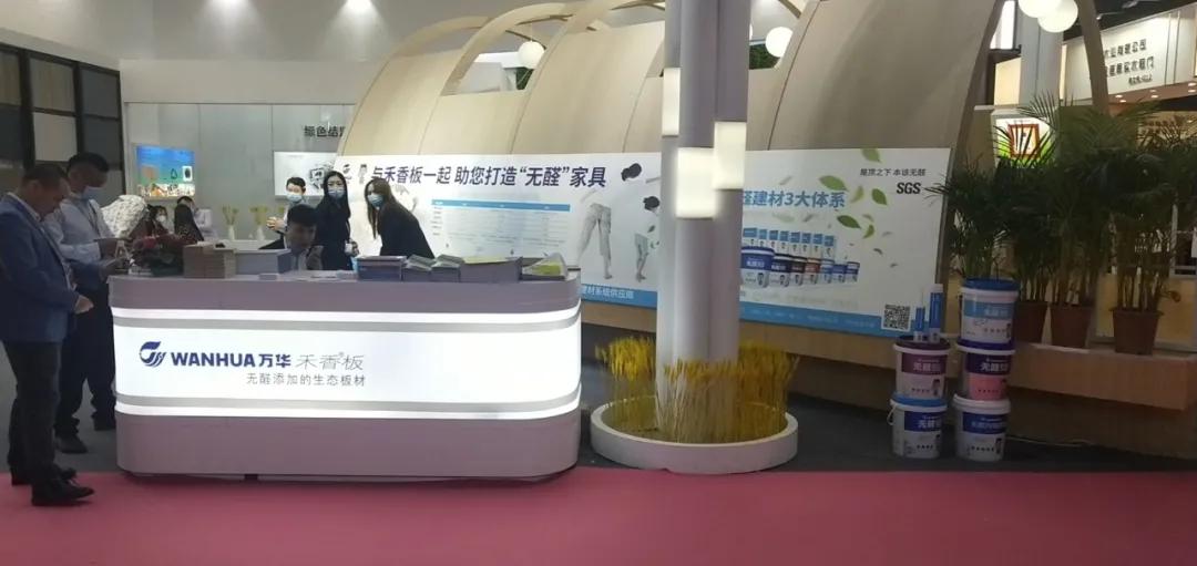 万华生态科技携全系灵荃产品亮相,为本届展会增色不少。此次展会,公司共展示了包括无醛乳胶漆、无醛瓷砖胶、无醛白乳胶、无醛腻子粉、无醛封边胶等30多款产品以及客户服务方案等。
