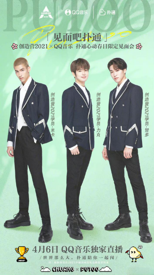 力丸、米卡、赞多的营外首秀来了!4月6日,QQ音乐“扑通心动·春日限定见面会”将在海花岛浪漫开启。而QQ音乐联手《创造营2021》推出的限定联名周边,也已同步上线,购买周边的创始人还可获得“上岛”资格,近距离与学员来一场心动值满格的春日约会。