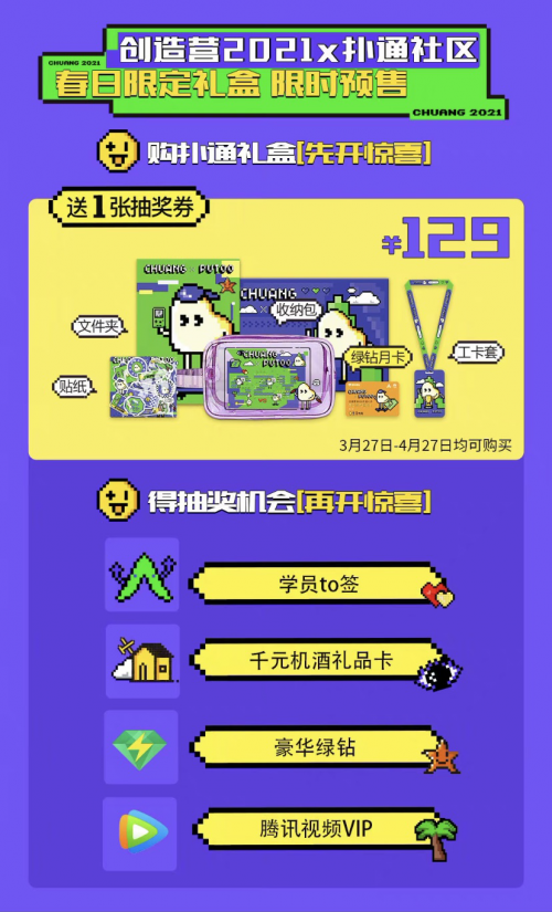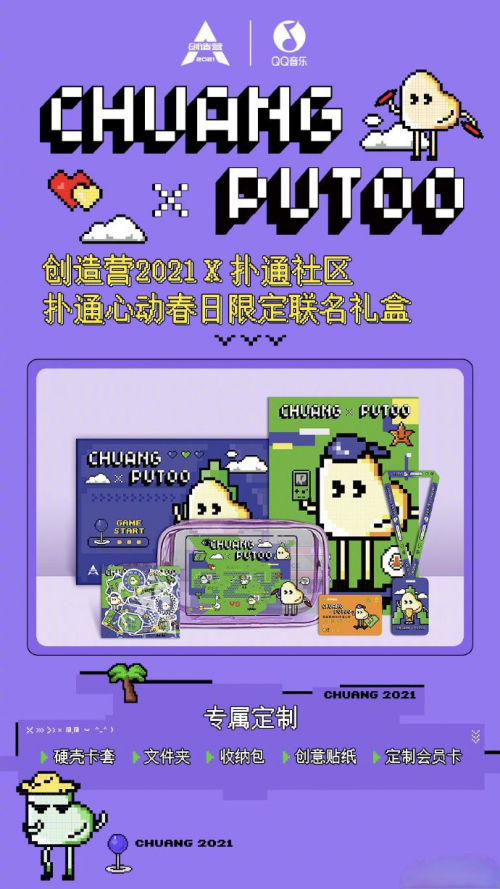 《创造营2021》x扑通社区“春日限定联名礼盒”也已经在QQ音乐正式上线。这一次,“扑通”化身创造营学员,创造性衍生出活力Rapper、实力Vocal和玩酷Dancer三款造型,寓意有着不同技能的学员都能在这场冒险旅程中“各施所长、勇闯通航”。联名礼盒里含有工卡套、收纳包、文件夹、创意贴纸等一系列可爱又实用的应援单品,每一样都暗藏小巧思,极具创4特色,绝对是每一位创始人的“春日标配”!