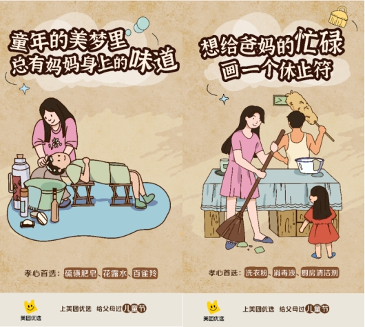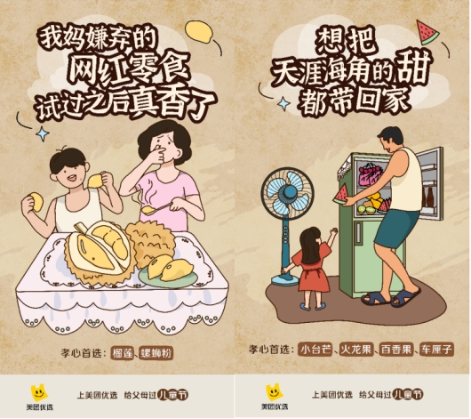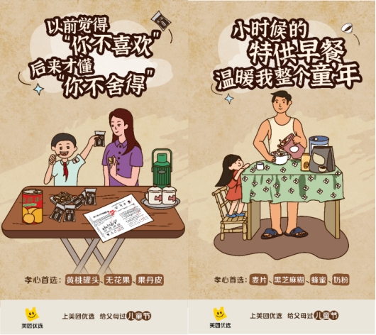“小时父母把好吃的都留给我。现在他们逐渐老去,我下单父母最爱吃的黄桃罐头和果丹皮,儿童节把他们宠成我心中的王子和公主”。一位95后消费者给美团优选团长留言。