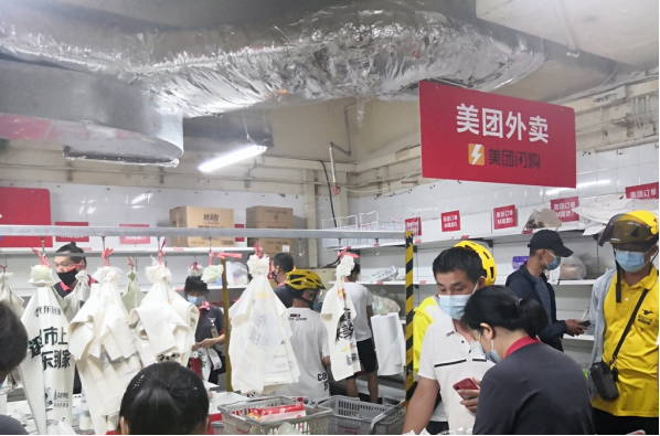 图注:超市内美团外卖提货区骑手们有条不紊地取货