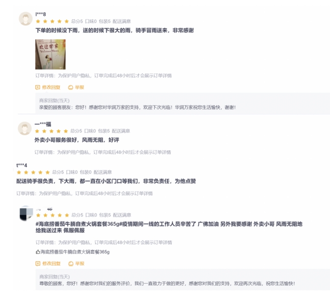 特别是近几日,广州迎来连续暴雨天气,强降雨天气给骑手配送造成了困难。即便如此,仍有大量骑手冒着恶劣天气坚守在配送一线,居民纷纷在美团外卖评论区向这些疫情背后的无名英雄表达感谢:“风雨无阻,为小哥点赞”“下大雨,都一直在小区门口等我们”“疫情一线的工作人员辛苦了”……
