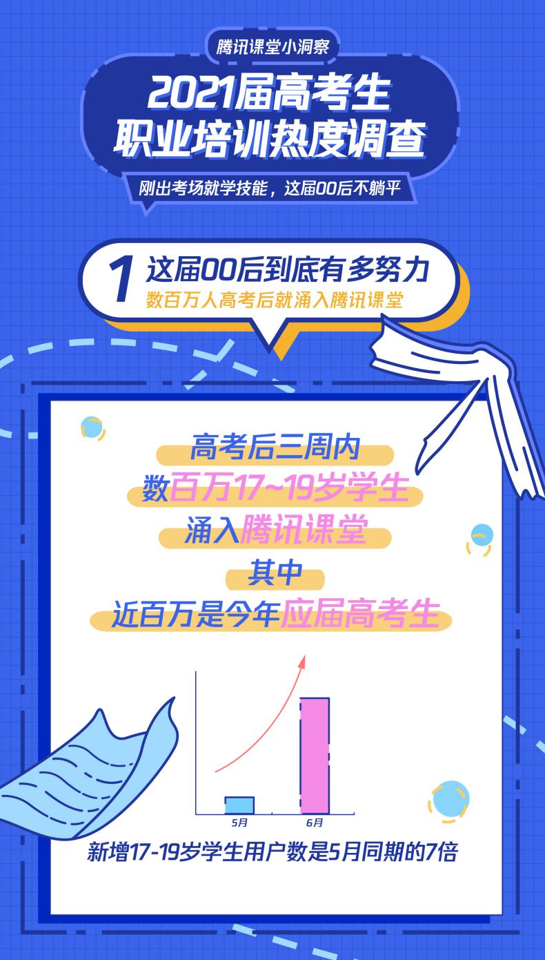 腾讯课堂也在高考后迎来了一群新的学员。2021高考结束后短短的三周时间内,数百万来自全国各地的17~19岁学生涌入腾讯课堂学习,其中约百万学生是2021届高考生;平台上高考后三周新增的学生用户数是5月份同期的7倍。