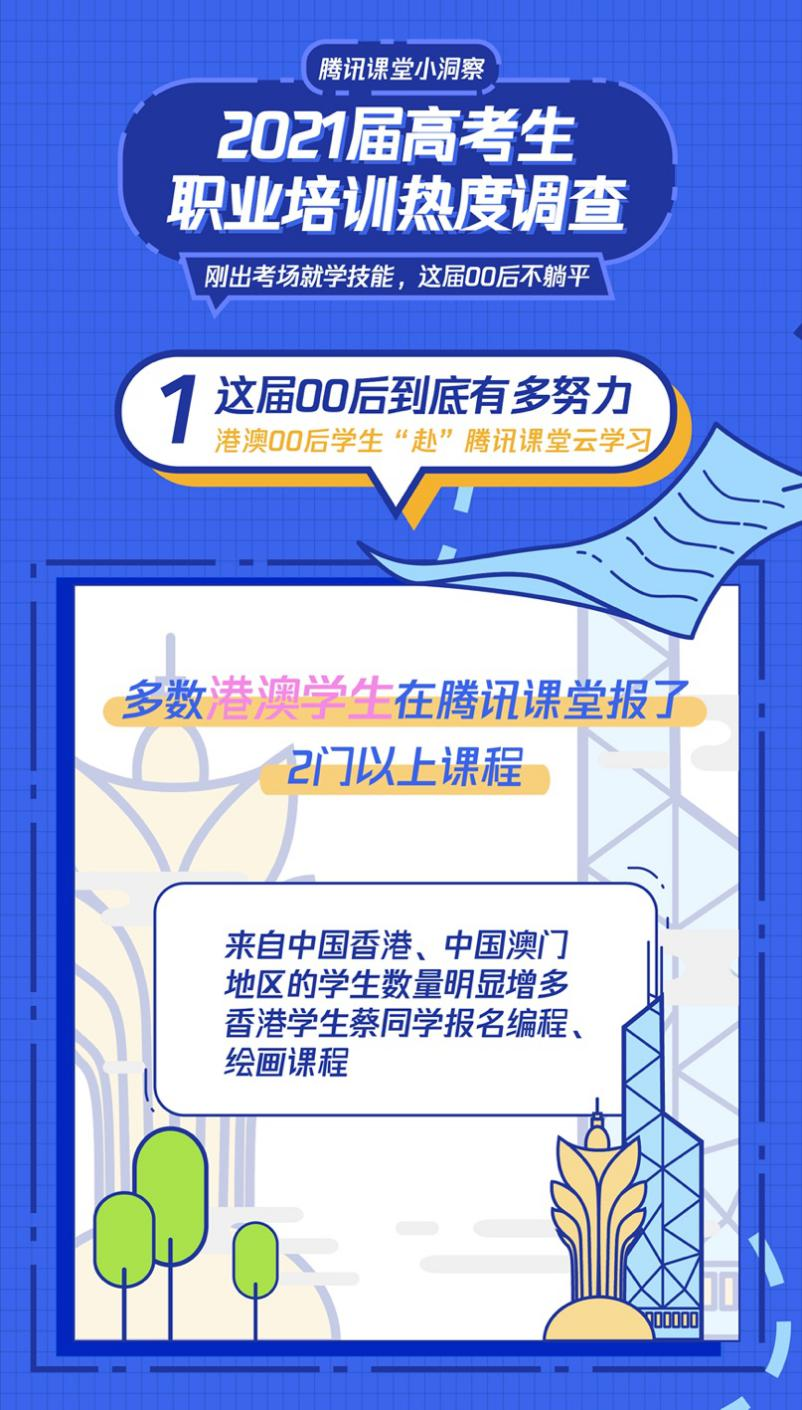 值得一提的是,随着职业教育在线化发展程度的提高,港澳学生选择到内地的在线职业教育平台上课也逐渐成为一种“小趋势”。据腾讯课堂相关负责人介绍,高考之后,有不少来自港澳地区的学生到腾讯课堂咨询报名。