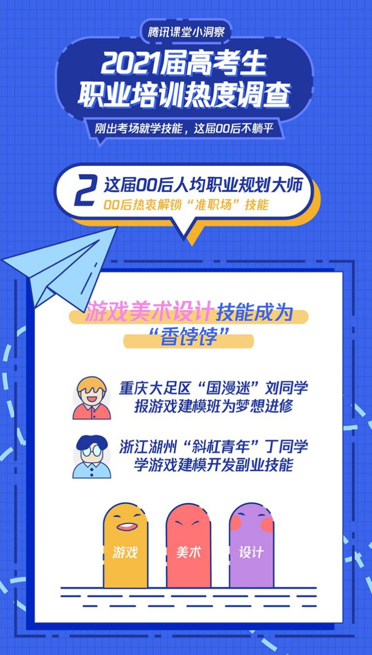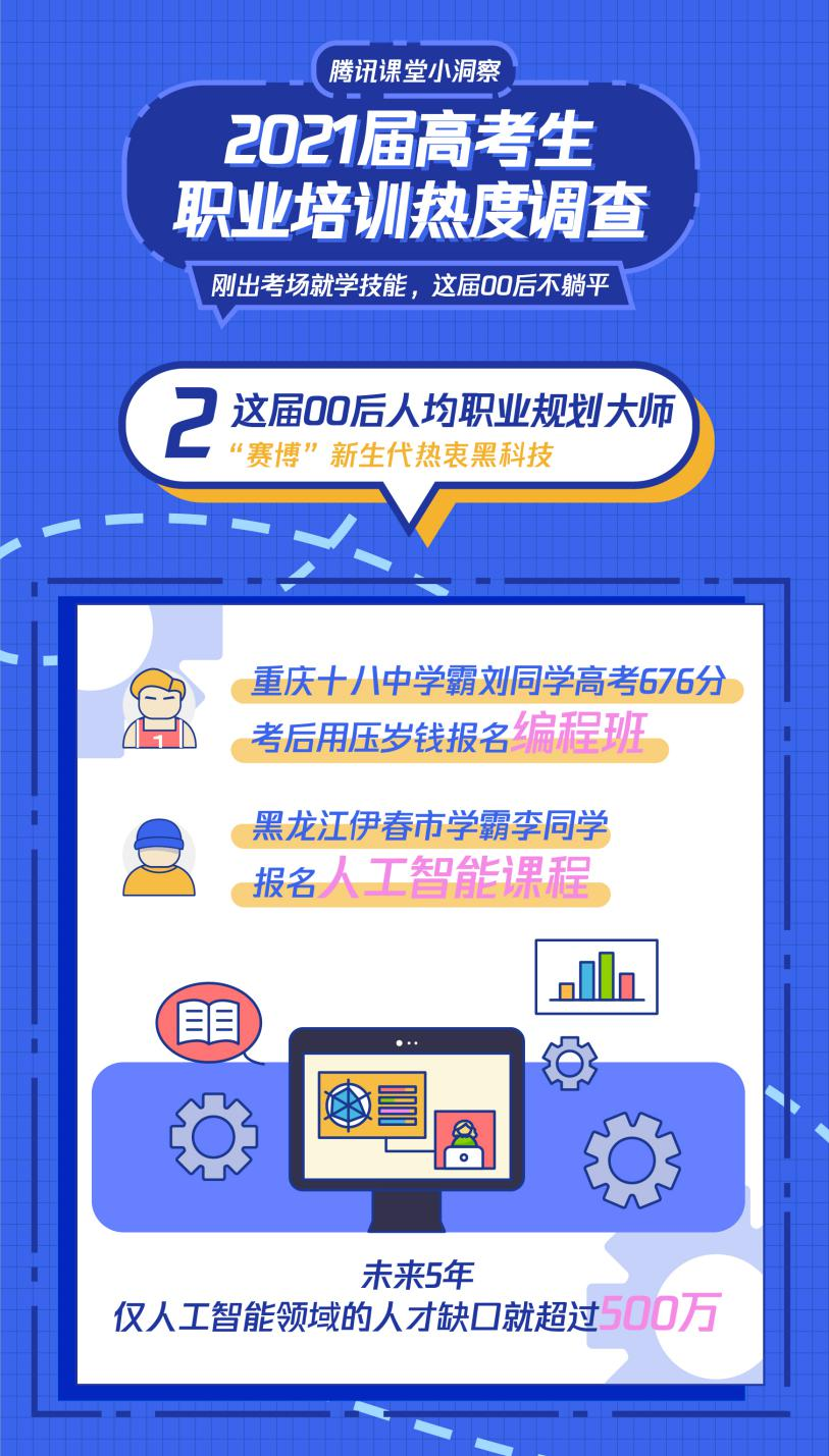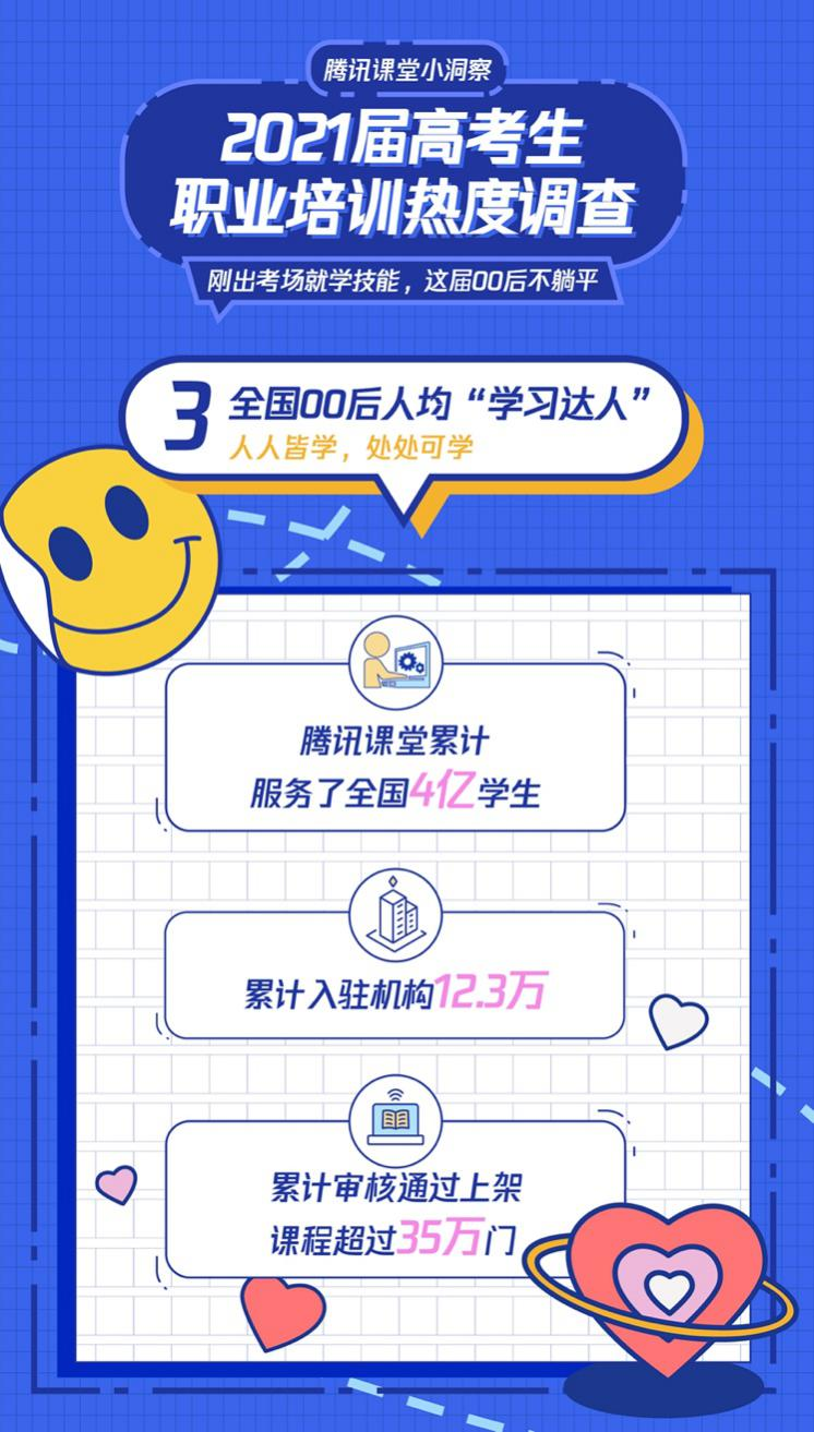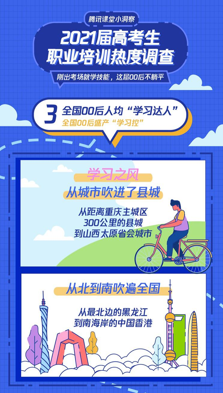 近日,全国最大的在线终身职业教育平台腾讯课堂发布的《2021届高考生职业培训热度调查》显示,2021年高考考生刚出考场转身就投入了职业培训课程的学习中,在学生群体中掀起了一股“提前掌握就业技能”的风潮。