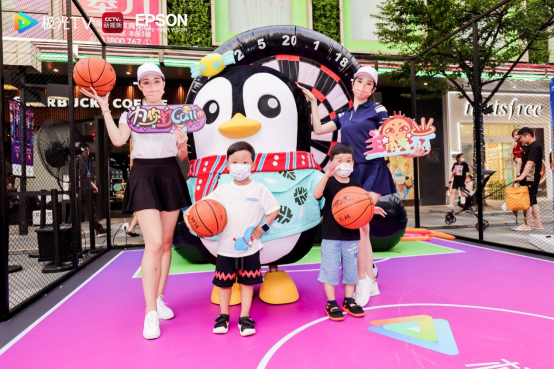 极光TV巡游车的终点是位于大宁国际商业中心的极光TV·大屏巡游日活动主会场,现场共安排了4个互动体验区,在开放式亲子体验互动空间,不少家长带着孩子在这里与卡通玩偶互动、与角色立牌合影;而在体育互动区,大量游客在足球、篮球互动区挥洒汗水并为出征东京奥运会的中国队选手们加油打气,现场热闹非凡。
