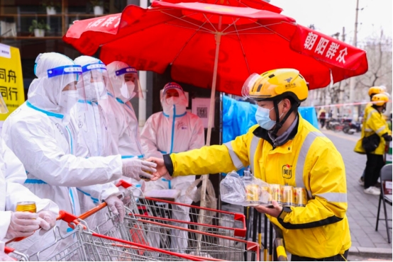 近期,全国各地疫情多点散发,原本繁华的城市街区按下了“慢行键”,为了保障城市居民的物资供给,筑牢疫情防控堡垒,各地外卖骑手、快递员等新就业群体在严守行业疫情防控指引,做好自身健康防护的同时,始终坚守在第一线,保障民生物资的顺利配送。近日,结合朝阳区管控情况,美团党委、美团配送联合属地街乡党工委,在朝阳区内有疫情的街乡、社区设置抗疫补给站,提供饮用水、方便面、口罩、消毒洗手液等生活及防疫物资。