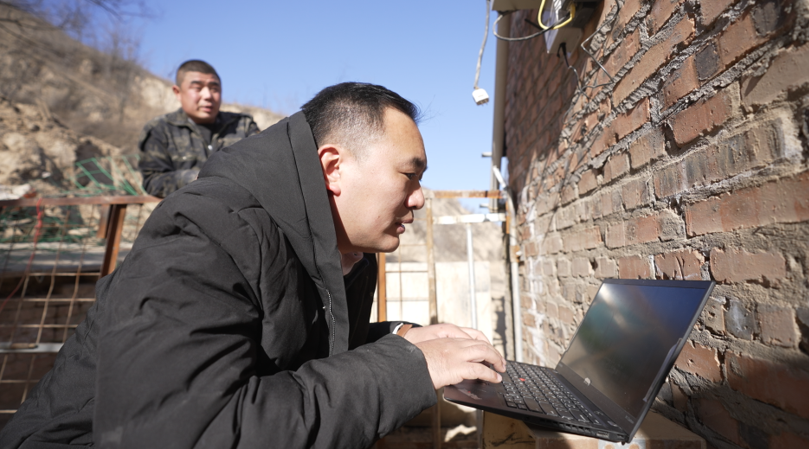 (图片说明:阿里巴巴员工在陕西清涧县教农民用物联网技术辅助土猪养殖。)