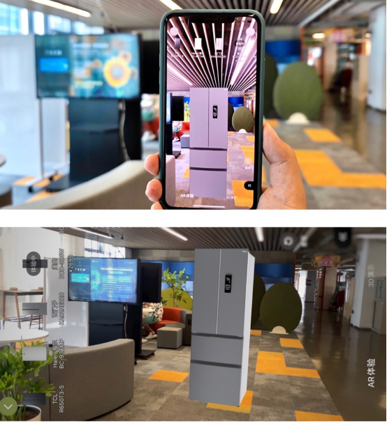 以选购冰箱为例,消费者可以通过手机屏幕把冰箱以3D投影的形式“摆放”在家里任意位置,AR投影的商品可以调整与实物1:1的比例,查看空间尺寸大小,及摆放在家中的实际效果,方便网购家电时“所见即所得” 。