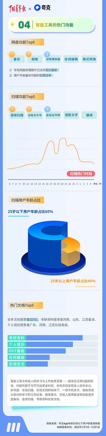 以夸克扫描王为例,数据显示,有超过一半的用户使用相机的场景是学习和工作,其中大学生的学习场景排名第一。过去一年,连续扫描的用户使用量最高,人均扫描超20页,全年转换各类文档格式超千万次,每天下午15点和晚上20点是扫描的高峰期。