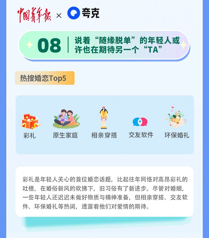 除了学习和健康,恋爱也是年轻人最关注的话题之一,夸克数据显示,在热搜婚恋内容中,需要提前做功课的“彩礼”最受年轻人关注。沈奕斐分析道,以前的爱情的逻辑体系是先感性再理性,但是互联网时代出现了以后导致理性先行,虽然你可能刚刚见到对方,但是就开始思考各种实际问题。这种顺序的倒置其实就会使得爱情变得更加的艰难。