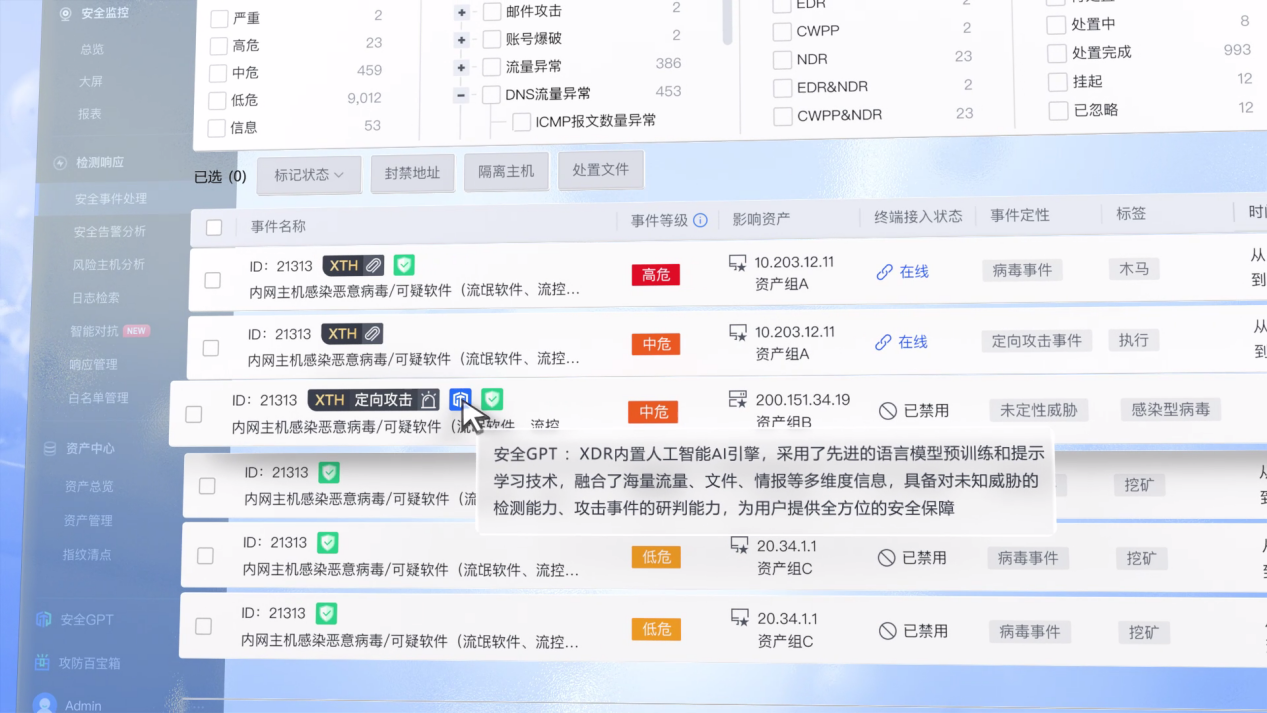 当前,安全GPT已落地70+用户,以XDR+GPT构建的安全运营“智能驾驶”,运营人员1人即可守护数万资产:
