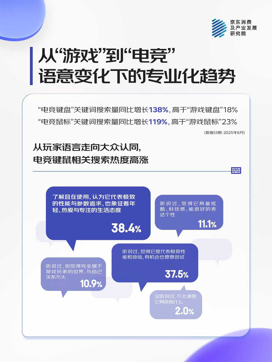 调研数据印证了这一微妙的语义变化。超过七成(75.9%)的受访者表示听说过“电竞键盘”或“电竞鼠标”,其中38.4%认为自己已在使用,并表示它象征着对性能的极致以及年轻、热爱的生活态度;在深度游戏玩家群体中,这一比例更是接近九成。可见,“电竞”正从品牌制造的营销概念,转化为用户主动选择、主动认同的标签。