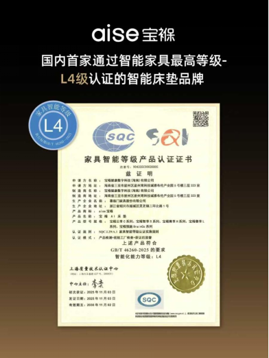 11月3日,喜临门旗下智慧睡眠生态品牌aise宝褓的“宝褓AI床垫”携五大系列率先通过《家具智能等级评定及标识》国家标准认证,成为国内首个荣获L4级最高等级认证的智能床垫品牌。作为该标准起草单位之一,喜临门此次率先获证,不但印证了自身在智能睡眠领域的技术实力,更以行业领导者之姿,重新定义智能床垫品类新高度。