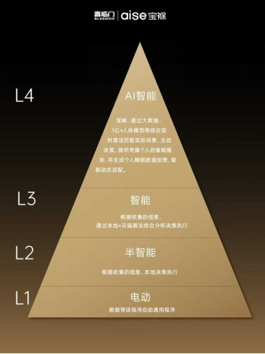 与传统智能产品相比,达到L4级智能床垫级别的aise宝褓,实现了从“被动响应”到“主动服务”的质变,通过感应监测系统、气动支撑系统和决策控制系统三大模块的协同工作,将智能服务无缝融入睡眠全过程。