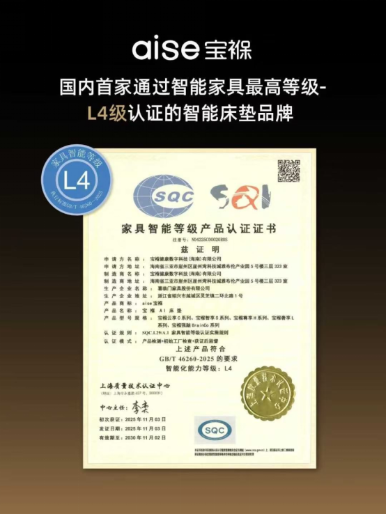 11月3日,喜临门旗下智慧睡眠生态品牌aise宝褓携五大系列产品率先通过认证,获得国内首家L4级智能床垫权威认证。这不仅是对aise宝褓技术实力的权威背书,也为消费者辨别真伪提供了可靠依据。