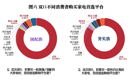 调查数据显示,在平台选择上,多样化供给和优秀的综合服务能力,使京东成为不同类型消费者的首选。对优先购买高端/顶配大家电的“顶配族”,83.88%的受访者首选京东购买家电,认可其“家电消费主场,新品大牌首发和品质信赖”的定位,排名其后的是线下渠道,具备“可实地体验”的优势,以及淘宝/天猫,以“活动广、品牌选择多”的特点吸引消费者。而对购买高性价比大家电的“务实族”,京东仍是84.73%的受访者的首选,认为其“补贴直给、型号齐全、服务可靠”;排名其后的是淘宝/天猫和拼多多。