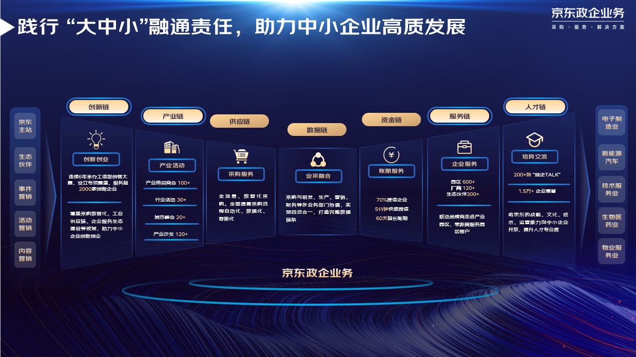 今年,京东政企业务还重磅推出了城市峰会系列活动,推动业采融合理念在区域企业更快落地。为了更好地服务中小企业创新创业,京东连续6年承办创客北京大赛龙头企业专项赛,为参赛企业提供产业协同、融合共创、助力经营等权益,充分实现“以赛助企”。