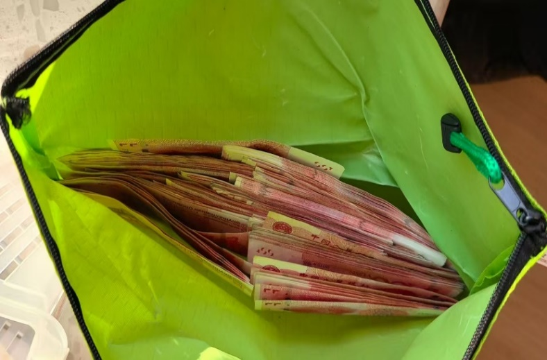 (图注:张南在收纳箱的布袋中发现现金)
