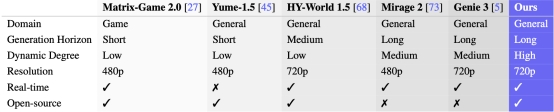 (图说:LingBot-World在适用场景、生成时长、动态程度、分辨率等方面均处于业界顶尖水平)