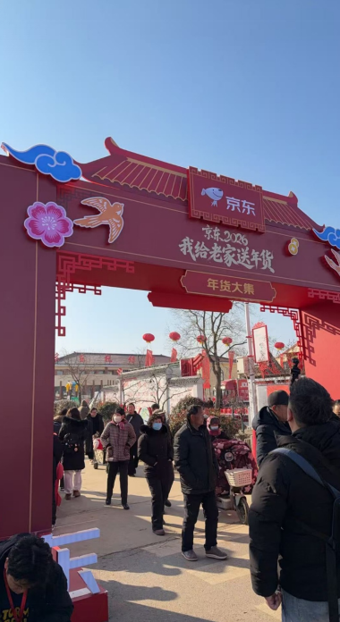 1月29日,江苏宿迁来龙镇光明村年味十足。京东在当地为乡亲们准备了超万件年货,并落地举办新春大集、搭建AI教室、打造“村晚”等新春活动,村民在现场排起长队领取年货、逛集采购,感受浓浓年味。