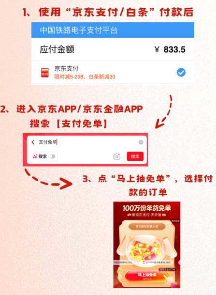 即日起,在 12306 APP 购票时,选择京东支付、白条,每日可享双重惊喜。首先是立减优惠,用京东支付、白条购买车票,随机享优惠,单笔最高可省 298 元;支付完订单后,来京东 App 搜 “支付免单”,选择付款的车票订单,即有机会享免单,参与 “十万份车票免单天天抽”。