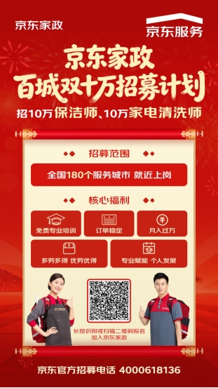 为保障春节期间千万家庭的洁净需求,同时助力家政行业职业化人才培养,京东家政正式启动“百城双十万招募计划”,将在全国180座服务城市招募10万名保洁师、10万名家电清洗师。通过免费开放的全链条专业培训体系,助力从业者快速持证上岗,培养高质量家政人才。